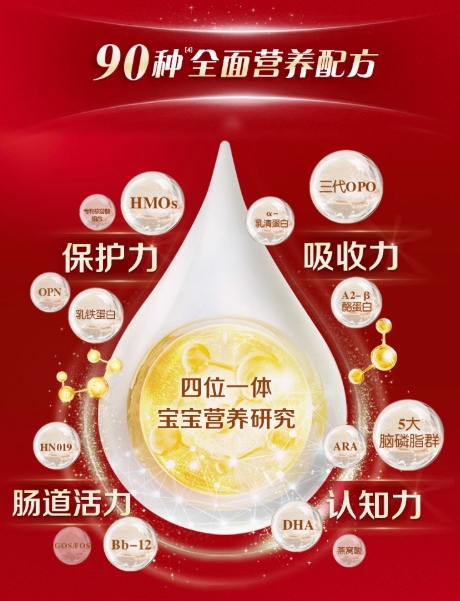 90种全面营养的“精准覆盖”:区别于部分奶粉只强调单一成分(比如只加乳铁蛋白),它一口气涵盖了90种营养元素,从基础的蛋白质、脂肪、碳水,到活性蛋白OPN、5种HMOs、双重益生菌等功能性成分,形成了“基础营养+强化功能”的复合优势。