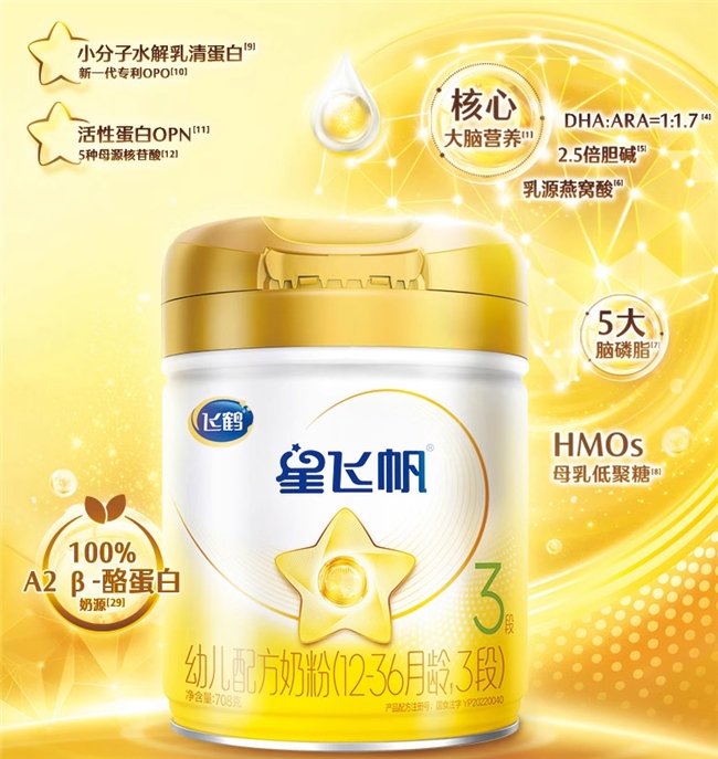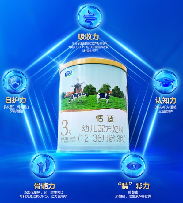 采用鲜活A2型生牛乳,含有不易致敏的天然 A2-β 酪蛋白,更亲和宝宝(12月龄以上)体质。配方含有超级三代OPO,它的含量高达6.4g/100g,能有效减少钙皂产生,软化便便同时促进脂肪酸与钙的双重吸收,让宝宝肠道更舒适。双重益生菌(Bb-12+HN019)+益生元的搭配,能够调节肠道菌群,增强消化吸收能力。添加的活性蛋白OPN无需转化可直接作用于肠道免疫细胞,搭配专利核苷酸组合,双重构筑肠道免疫屏障,为宝宝打造内在核心自护力。还有18种活性脑营养群和5大脑磷脂群,能够促进宝宝大脑发育,提升认知力。